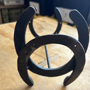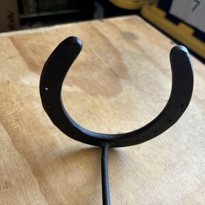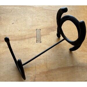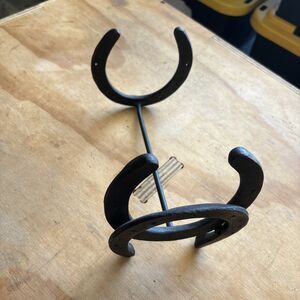 This preowned black horseshoe wine holder measures 10" x 6" and is in excellent condition. Perfect for holding a bottle of wine, it adds a rustic charm to any space. Ideal for wine enthusiasts looking for a unique and functional display piece.