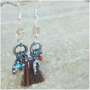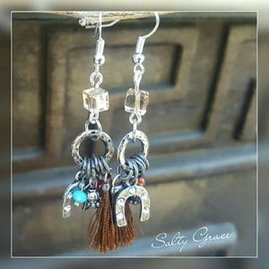 Cute dangle charm w beads, tassel and Horseshoe, topped w a genuine cubed nude Swarovski Crystal. Placed on stainless steel earring hooks. Approximately 2 3/4" in length. Discounts given on bundles. Hand designed and created by me.