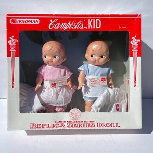 Comes with Certificate of Authenticity which states: “Horsman affirms that you are the owner of a Limited Numbered Edition Pair of authentic 1948 Campbell's Kid Chef Dolls that are part of a Replica Series. The Campbell's Kids were first illustrated in 1904 by Grace Drayton and quickly gained popularity as advertising characters. In 1910, the first Campbell's Kid dolls were manufactured by Horsman. They featured "Can't Break 'em" heads and cloth bodies stuffed with cork. The Replica Series is officially authorized by Campbell Soup Company. Limited Edition- 10,000 pieces.