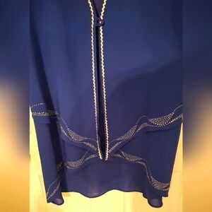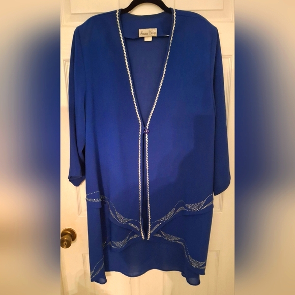 Elegant blue cardigan with intricate bead detailing Open front design, shirt