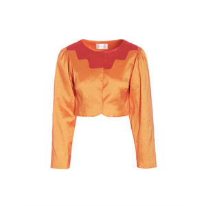 Cropped jacket, featuring a red wavy neckline with wavy embroidery details. The jacket has hidden push-buttons in center front. Style the jacket with matching pants for a complete look.