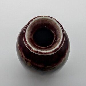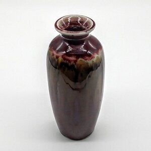 Rich glazed small vase from Hosley Potteries in cranberry red, green, tan and gold tones.