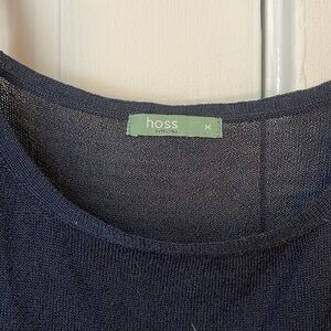 Gorgeous dress by Hoss Intropia! No materials tag - it has been cut out, but feels like silk! Really beautiful fabric and shape. Somewhat of a mesh-like knit in Navy. Would be beautiful for summer!!