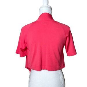 Super cute pre-owned Hoss Intropia Coral Pink Red Orange Cardigan Shrug Size Small. Waterfall draping on front. Nice stretchy knit fabric. No stains or holes. Please ask all questions before purchasing.