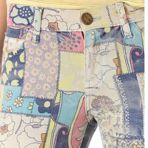 Current/Elliot BNWT patchwork "Moto" ankle skinny jeans in medium blue wash with lightly faded, pastel colored designs (resembles the look of the '70s w floral designs and polka dots). The top portion looks like a pair of shorts w designs stitched on the jeans, and then there's more on the knee area, which has factory destruction on them. In between the upper and knee designs are "Moto" stripes. Each item is a one-of-a-kind piece of art! See ⬇️ for more details & measurements! No trades please!