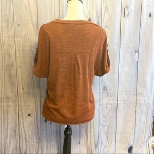 This top is in great condition with minimal signs of wear. It was maybe worn a handful of times. It is 97% polyester and 3% spandex. It is machine washable. This top is a shorter top but not a crop top. Great for any casual outing or a day at the office.