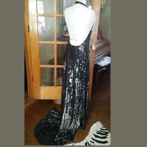 This gown is breath taking. Floor length with a tail that puddles.. it has side slits for easy walking.. never worn. Just tried on. It has cutaway shoulders . A deep scoop back with a halter neck fastening strap..fits true to size 8. Featured in Sarasota magazine. $2309.. sold out !! (Gray almost black sequins) Price Firm- No Trades. MEASURES -SHOULDER TO FRONT HEM APPROX 64" - CHEST IS APPROX 15" FLAT ACROSS-SIDE SLITS ARE 37" LONG- IT'S VERY HARD TO MEASURE WAIST BUT IT'S APPROX-16" FLAT