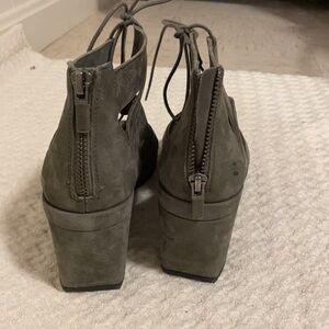 Great pair of sandals w new rubber ridged soles- back zipper and 3” wedge. Slight scuffs on wedge area- see pictures