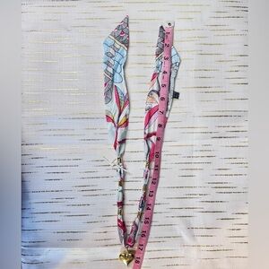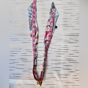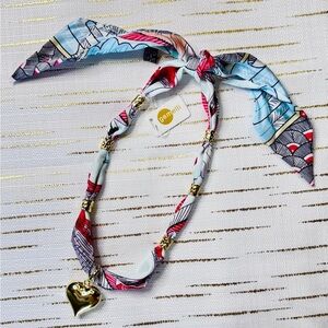 Elevate your accessories with this Gemelli designer scarf necklace, featuring a vibrant printed fabric woven with gold bead accents and a bold gold heart pendant. This unique piece combines the feel of a silk scarf with the look of a statement necklace — perfect for adding a luxe pop to any outfit. Adjustable tie closure makes it versatile for styling at different lengths (approx. 32” end to end).