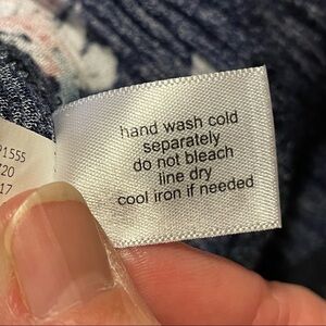 This blouse is in good condition with normal signs of wear. It is long sleeve and has some design around the bicep on the sleeve as I have shown. It is 100% rayon and a hand wash item. This is a nice looking top for a day at the office or a formal event with a skirt. It does have a v-neck and a button at the top. It does run on the larger side.