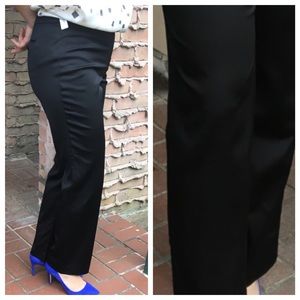 NWT, black satin, sits lower on the waist, straight leg/ Stretch, Dry Clean, 66% Rayon, 32% Cotton, 2% Spandex