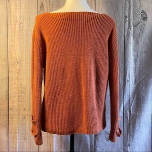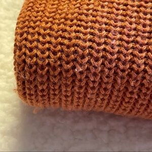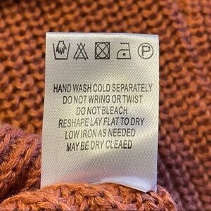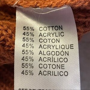 This sweater is in good condition with normal signs of wear. It does have some piling as I have shown. It is a v-neck and is 55% cotton and 45% acrylic. It is a hand wash item. This sweater is a cropped sweater and is a burnt orange or rust color. Great sweater for any casual outing.