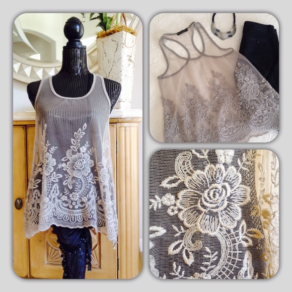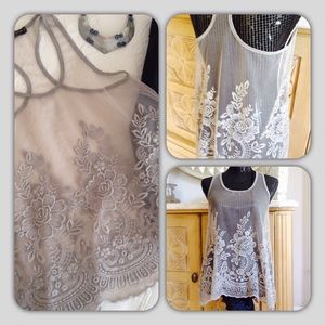 Beautifully Embroidered Roses & Scalloped Hem. Sheer Mesh. T-Top Tank. Size: M Color: Taupe Brand: Love To Love Los Angeles