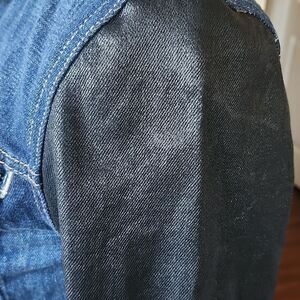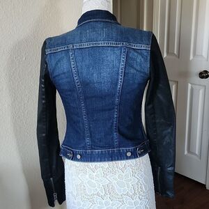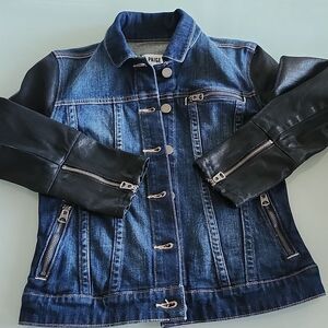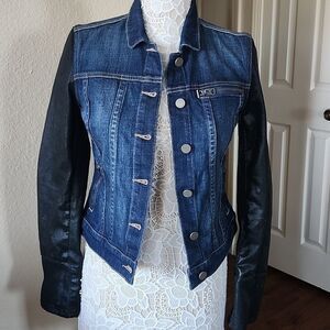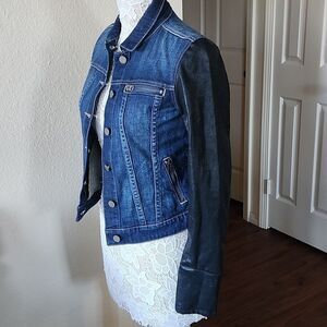 Adorable jacket with "coated" denim sleeves, 3 zippered pockets, and button down front. This beauty is in EUC. B33.8221.2/26