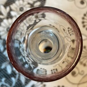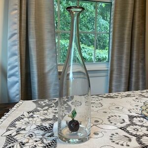 Long fluted neck with a plum colored glass rim. Slender, sleek and beautifully designed with glass grape- plum with leaf and stem! Can you see this at your table?!