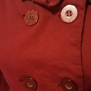 Crimson ruffle neck pea coat. This would be a great for date night with your favorite pair of jeans. It has ruffles along the neckline and glitter buttons on the front and on the two pockets. It is very flattering with a high waist and baby doll shape.