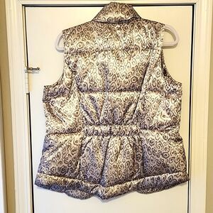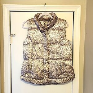 Metallic white and grey cheetah print puff vest.