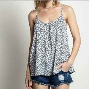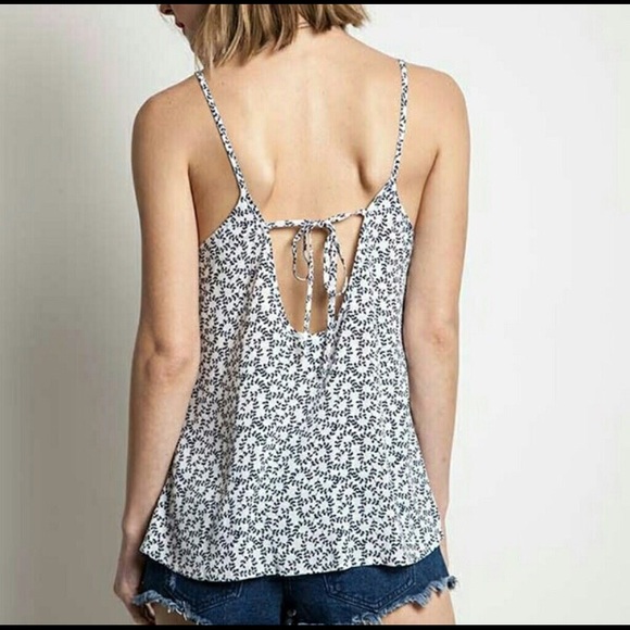Sunny skies tie back tank is boutique, new with tags. Tank is loose fitting and has a cute tie back. Tank is white with navy vine pattern. Looks great with jean shorts! Available in small, medium, or large.
