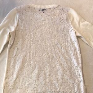 This sweater is in good condition and has only normal signs of wear. The body is 58% cotton and 42% viscose. The lace is 37% nylon, 33% cotton and 30% viscose. This sweater is great for career and casual.