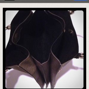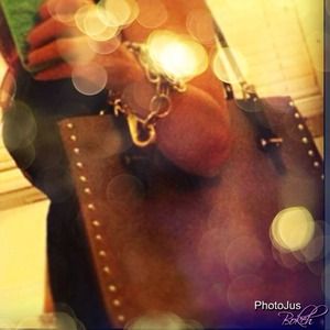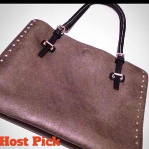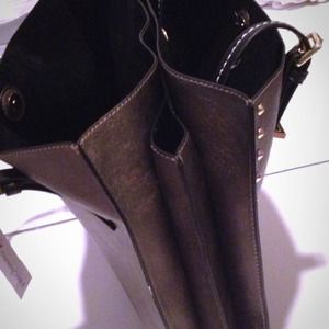 Bronze/taupe colored with gold hardware & gold rivets black leather straps it has 3 compartments very cute & chic 🚫trades Price is firm