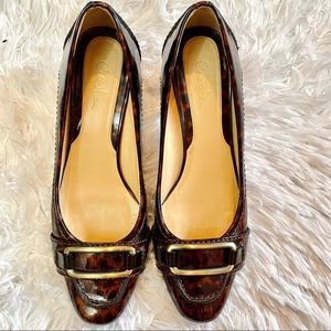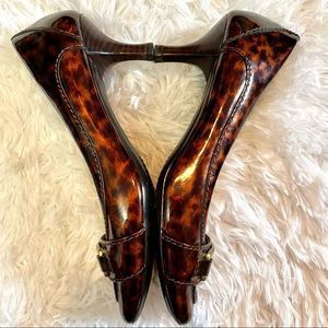 Excellent pre-owned condition patent leather tortoise pattern Helena kitten heels by Cole Haan, size 6.