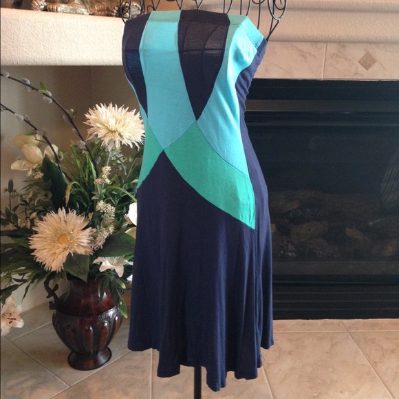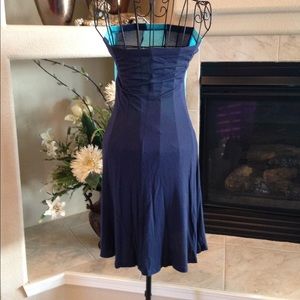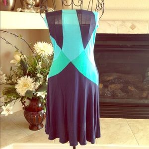Colorblock dress in different shades of blue, tube top and flare bottom. Bought this in a boutique in Austin, TX 100% rayon