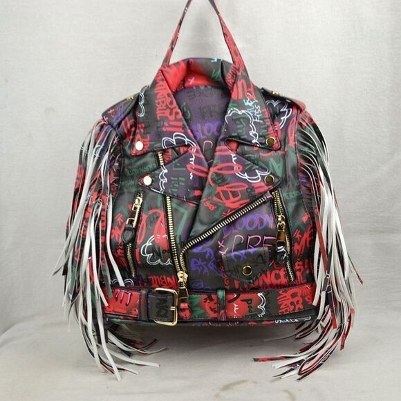 Multi Graffiti Printed Motorcycle Jacket Fringe Backpack