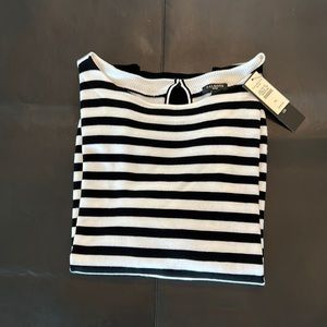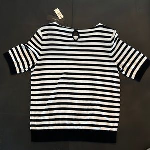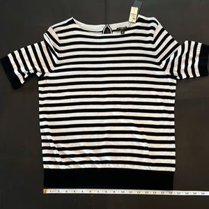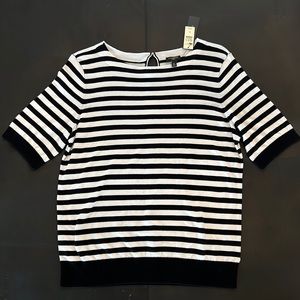 Brand new, never worn with tags still on. Crisp black & white horizontal stripe, short sleeve, lightweight sweater material, with loose ribbed waist band. Stripes are 1/2” wide. Back button design is unique with an open oval loop style. Comes with extra button. Material is 60% cotton and 40% rayon. Classic sweater.