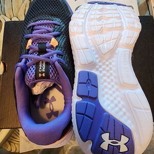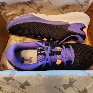 NIB. Under Armour GGS Charged Rogue 3 Tennis Shoes. The box says the color is black and blue. The blue is more of a purple color.