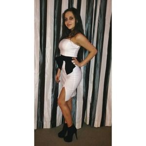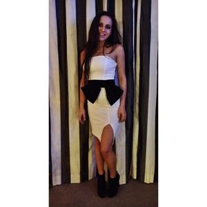 Pure white strapless midi dress with black oversize bow. Sexy 7" slit on left side. Never worn. Shell: 75% Rayon, 21% Nylon, 4% Spandex. Lining: 100% Polyester. *more photos coming soon!* This dress is absolutely perfect for a bride to be to wear to the bridal shower ;) smoke free, pet free home