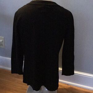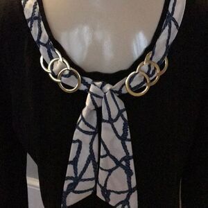 august silk black knit top. 3/4 sleeves. Silk lightweight fabric collar band of blue rope pattern on ivory background. Front gold triple circle embellishments. Viscose/silk/ nylon blend. New, no tags. Size petite medium. Nonsmoking home.