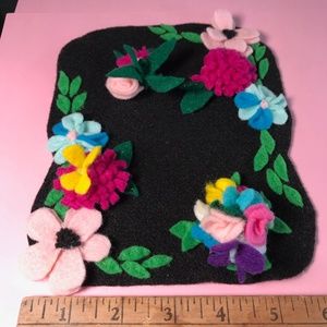 The handmade flower mat is made out of felt, thread, and tiny dots of hot glue for fabric.