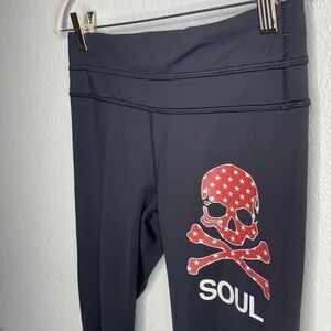 Lululemon soul cycle collaboration black inspire crop leggings. Features red skull and cross bone with small white stars on upper left leg with the word “soul” in white. Has back zipper pocket and two small slit inner pockets. In excellent condition like new. Size 6