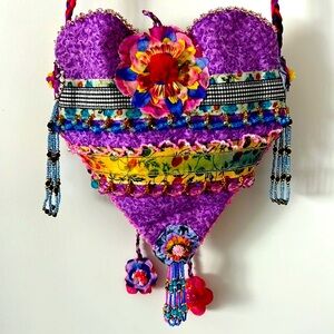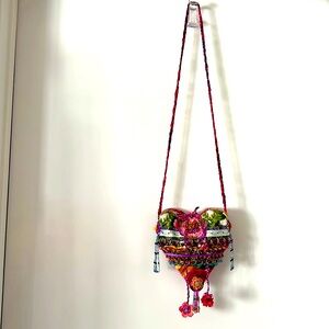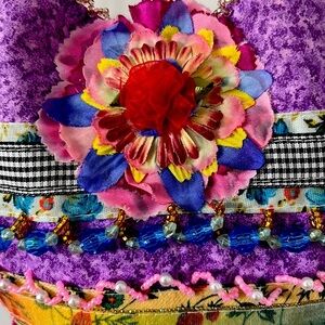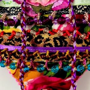 Wildly unique one-of-a-kind absolutely playful and completely handmade with lots of TLC. Created using myriad techniques — beading, stitching — made by one artisan in the USA 2005. Hand braided carry strap is 21” long for cross body. Charming fabrics and ribbons. Hand composed flowers. Tie at the top with braided cords w flowers at the ends. Fully lined. From Aspen CO. Barbiecore vibe!!!