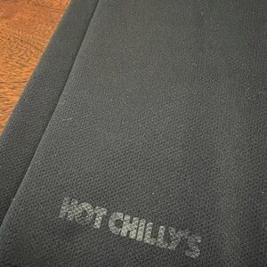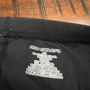Stay warm with these Hot Chillys black thermal base layer leggings, size large. Made in Canada from 100% polyester. Excellent for cold weather, skiing, snowboarding, or layering.