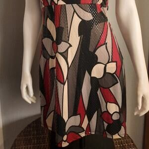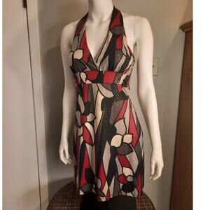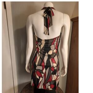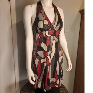 Sexy halter dress with a low-cut plunge v-neckline and necktie halter top. Features an empire waist, lined bra, and unlined skirt. Covered in red, black, and ivory graphic design with shimmering sequins. Polyester/spandex blend for a stretchy, comfortable fit. Perfect for party, holiday party, office party, prom, or homecoming. Eye-catching graphic print, glittery shimmer, and a bold sexy cut make it a true statement dress.