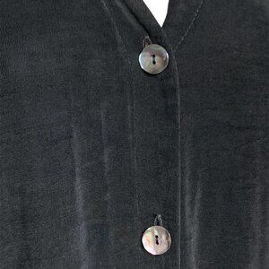 Description: Black Slinky Longline V-Neck Travel Top/Cardigan with Side Slits and 3-Buttons that are Shell/Mother of Pearl.