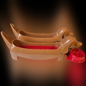 Fun and functional dog-shaped hotdog cutter with bowl for sau e. Available in red and green colors. Perfect for adding a playful touch to your mealtime.