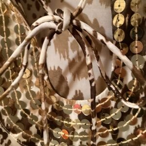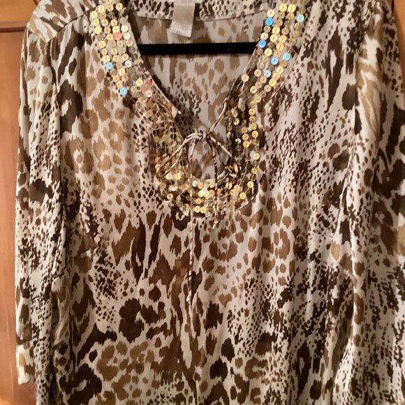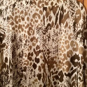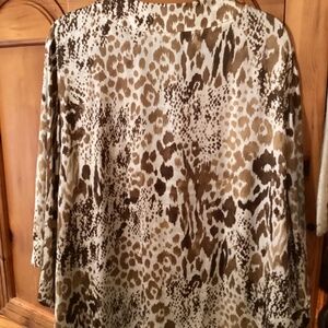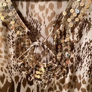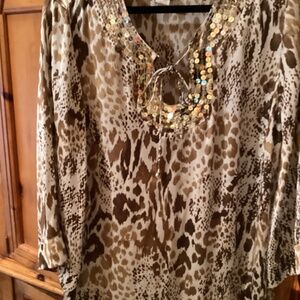 This blouse is from the Hot In Hollywood collection. It’s very light weight easy to wear. It has a keyhole opening at the neck, ties with a small bow. adorned with light beige sequins. It’s in very good condition, Size 1X