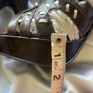 HOT IN HOLLYWOOD Silver Lacing and Chocolate Vegan Leather Lace Up Stiletto Heels Size 9. Man made leather has some creases. Great condition.