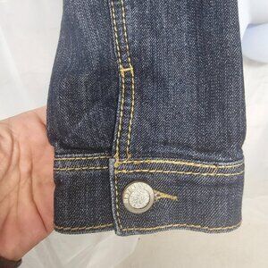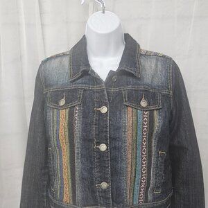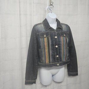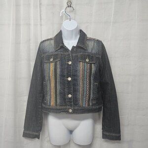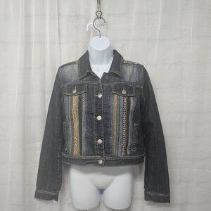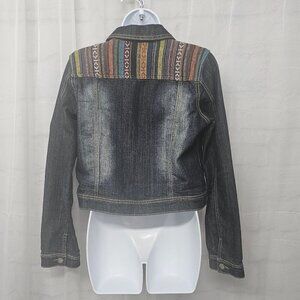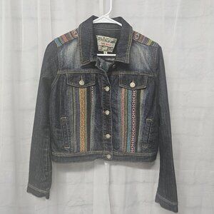 Hot Kiss Blue Denim Aztec Tapestry Jean Jacket Bohemian Southwestern Cropped L