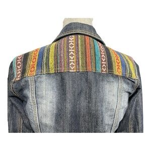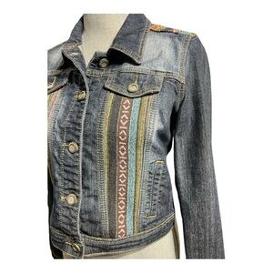 Hot Kiss Denim Jean Jacket With Western Southwestern Embroidered knit Design long sleeved button up. Condition is lightly preworn.