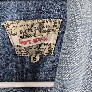 This Hot Kiss denim vest features a light wash with intricate Aztec-inspired embroidery on the yoke for added style. The button-front closure offers a secure fit, while the frayed armholes add a touch of edginess to the design. Made from durable cotton denim, this vest is perfect for layering.