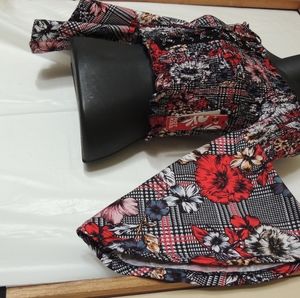 Colors - red, black, tan, purple, blue graphic flowers.
