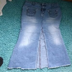 This sexy mermaid/trumpet or slightly flared denim skirt is size 9 and has factory fraying and whispering for that distressed look, plus a looong slit.