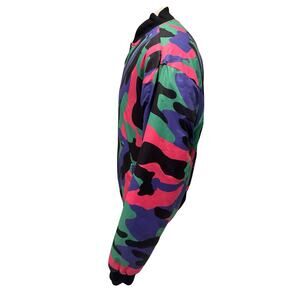 multicolor camo shell in purple, green, pink, and black with an oversized