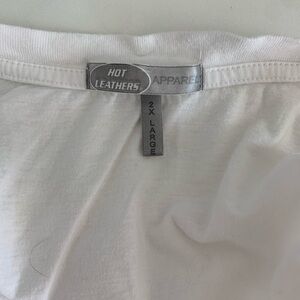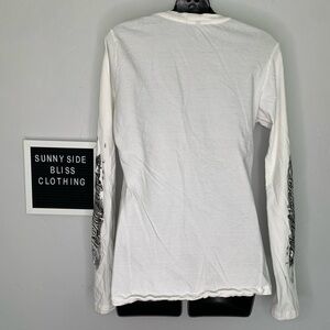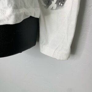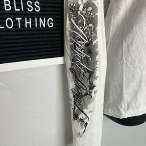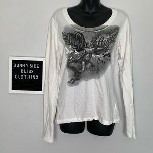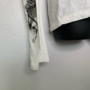 This is a white long sleeve scoop neck shirt with a gray graphic on the front and “asphalt angel” on both arms. It’s a size 2XL but fits like a XL. It has a few stains (See Photos for Details).