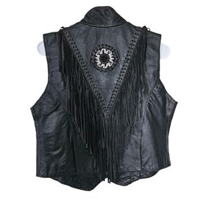Hot Leather black leather vest. Fringe. Native American details. Snap front.