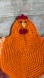Charming handmade pot holder in the shape of a chicken. Vibrant orange with red and yellow accents.