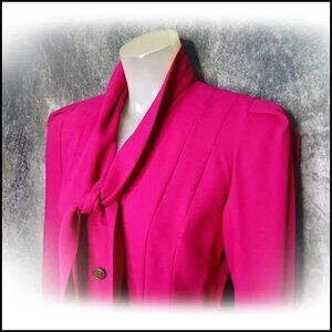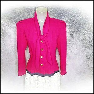 This cute jacket is all about the styling (and those shoulders). Hot pink / fuchsia Barbiecore. Curvy silhouette with antique goldtone buttons down front. Unlined, lightweight poly crepe. Shawl collar ties in front (or not). Wonderful seaming forms little pleats at bottom! Navy blue trim at the hem and bracelet length sleeves and did I mention those shoulders? Some edgy styling options shown but you should do YOU! (this is pretty edgy to begin with)